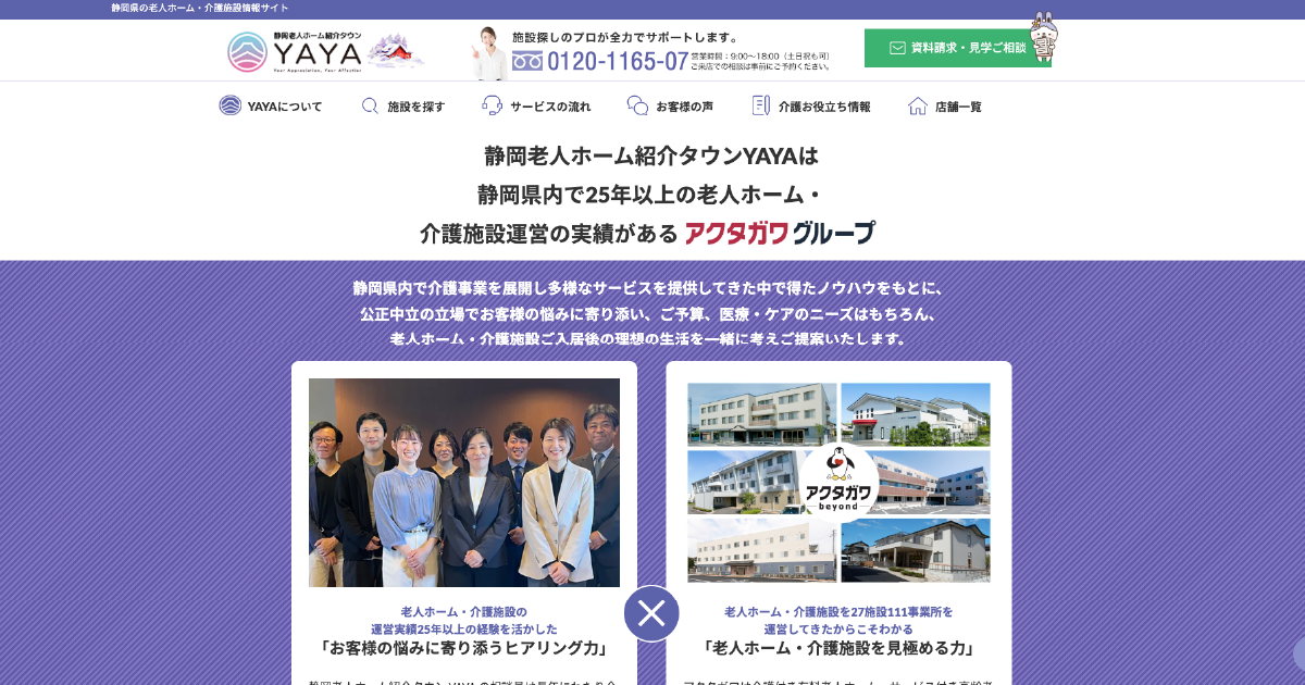 「静岡老人ホーム紹介タウンYAYA」は静岡県内で25年以上の老人ホーム運営実績があるアクタガワグループが運営しております。アクタガワグループの介護専門相談員が豊富な経験をもとに無料で老人ホーム探しからご入居まで、親身にサポートいたします。TVCM放送中です。